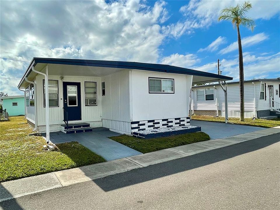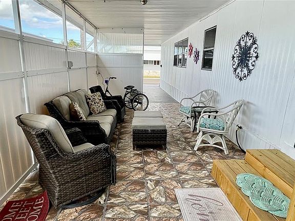 2 bed, 1.5 bath, Florida room home in a well desired 55+ park. This home comes TURN KEY, MOVE RIGHT IN... SHARE is included in list price (valued at $55,000); Home has updated touches through out the home, #1 is the kitchen featuring ample amount of warm wood cabinetry and countertop and backsplash... newer lighted fans in both bedrooms... some updated light fixtures... water heater 2023... Roof is coated every 2 years... laminate flooring through out, NO CARPET! Much sitting/entertaining area under the covered front patio, side patio surrounded by a privacy fence AND a sitting area added by the seller for some great sunning on the side of the privacy patio. This park is in close proximity to the beaches, airports, I – 275, churches, restaurants, all kinds of shopping, etc.… very inexpensive living at ONLY... $183.05 per month which includes all the amenities one could want; WATER, SEWER, and TRASH, owned clubhouse, escrows are fully funded, beautiful heated pool and spa, fitness center, library, shuffleboard, billiard table, and a small lake at the back of the park, laundry room, and your very own private entrance to the super Walmart… on foot, bicycle or golf cart… Etc., etc. GOLF CART may be negotiated.