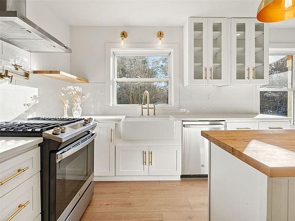 Butcher block islandEnclosed sunroomAmple cabinet spaceQuiet streetHardwood flooringVent hoodSeparate pantry
