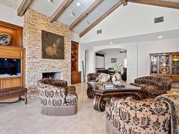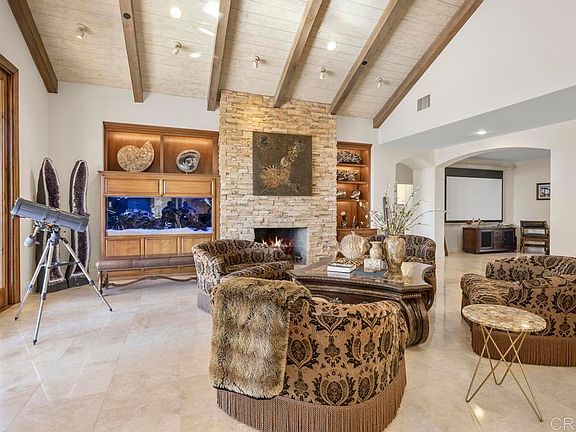 Enter 3457 Via Zara Court, a Fallbrook paradise estate property featured in multiple Home and Garden magazines, through a welcoming private gate and swing on up the driveway as you look upon the fully fenced and beautifully landscaped 2.58 acres! Panoramic views including sunsets over the infinity edge pool and spa provide a tranquil setting that is private and so relaxing! Indoor and outdoor living blend seamlessly with cantina style doors, multiple covered patios, stacked stone outdoor fireplace, seating area and also a well appointed stainless built in BBQ with extra burners and refrigerator. Usable land abounds with easy access to the grove area and a varied selection of fruit trees and avocado trees! 7 raised container gardens for all your vegetables and herbs include irrigation and lighting, an outdoor garden potting cabana with electrical, 2 gorgeous fountains and additional crafting structure to add to the outdoor activities! Inside, enjoy soaring cathedral ceilings designed by renowned architect Bill Kiddoo. 2 custom fireplaces with stone hearths to set the mood. Great room style gathering room opens to the kitchen, multiple islands, spacious breakfast area, custom finished cabinetry and hood and there are travertine floors throughout the home and outdoor patio. There is a gorgeous built - in saltwater fish tank with its own outdoor "fish house." An executive style office has extensive built-in cabinetry, all bedrooms have ensuite baths and there is even a separate media room to watch your favorite tv/movies. Primary bath includes high end finishes, a steam shower, dual closets, and a spa bathtub with garden views. This stunning and unique property is upgraded at every turn, and is even better in person when you can feel the breezes and hear the chirping birds all around! Paradise found!