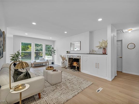 This charming brick ranch is nestled on a rare double lot in highly sought-after Rocky River, offering nearly an acre (0.81 acres) of serene, private land that backs directly onto Metro Parks. Only three owners have cherished this property, making it a true gem. Inside, new LVP flooring from ROI Supply’s J Bella Line flows seamlessly through the main level. Cozy evenings by the wood-burning fireplace in the living room welcome relaxation. The stunning, brand-new kitchen features sleek shaker cabinets with soft-close drawers, elegant quartz countertops, and stainless steel appliances—perfect for cooking and entertaining. Thoughtful updates include widened doorways and an open floor plan that enhances space and accessibility. The main level has three bedrooms and a remodeled full bath with a new tile shower, toilet, vanity, and decorative art deco wallpaper. New double-pane windows provide energy efficiency and quiet comfort throughout. Step outside to a new deck with views of the expansive, private backyard—ideal for outdoor gatherings or enjoying nature. Other improvements include a new roof (2020), new furnace, exterior drain lines, and a new A/C system, ensuring move-in readiness. The partially finished basement features a second full bathroom, also remodeled with a new tile shower, toilet, and vanity. A second wood-burning fireplace adds charm, along with a fourth bedroom with new carpet and walk-out access to the backyard. All mechanicals are neatly enclosed, creating a polished space. This move-in-ready home offers the perfect blend of classic charm, modern updates, and exceptional outdoor living on a rare, park-adjacent lot. Don’t miss your chance to own Rocky River’s finest!
