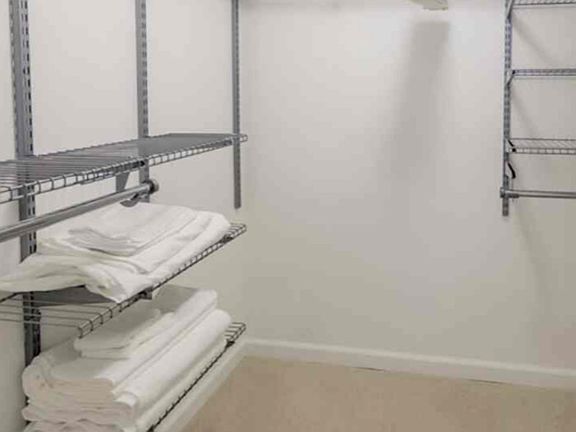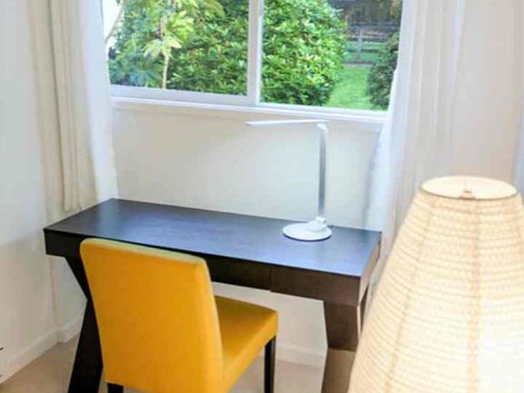Queen bedBright work areaTwo walk-in closetsPrivate sun deck