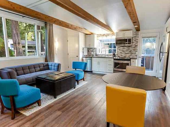 appliances including a dishwasher, full size front load washer/dryer, private sun deck, bright work area, two walk-in closets, full bath with walk-in shower, queen bed. Huge windows overlooking green spaces. Great spot to decompress after the work day. You'll be living in an estates neighborhood and will want to have a car, but plenty of walking and running trails and beauty in every direction.