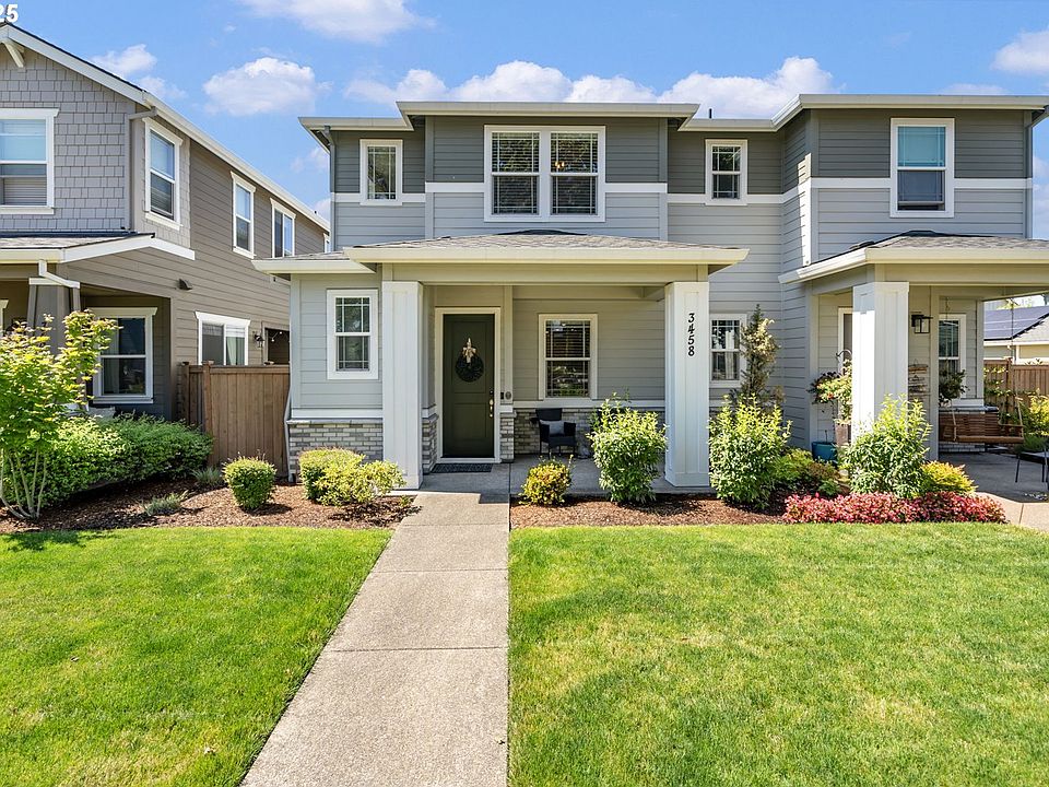 Reed Crossing townhome with 3-bed, 2.5-bath with community park right out your front door, lot of shopping, and nearby amenities. Featuring 1,475 square feet of smartly designed modern spaces. Kitchen includes large island with quartz counter tops, gas range, Luxury Vinyl Plank flooring on main level, covered patio, 2 car garage. indoor laundry on upper level with bedrooms. You won't want to miss walking through this home, call your agent today to set an appt. [Home Energy Score = 10. HES Report at https://rpt.greenbuildingregistry.com/hes/OR10197626]