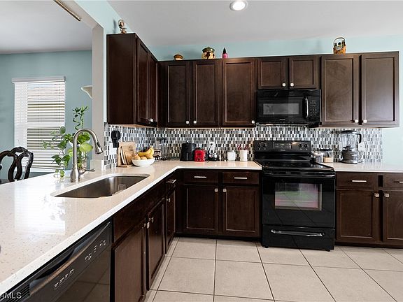MOTIVATED SELLER!Low HOA fees, No flood insurance required, No CDD, No assessments and a new roof! Looking for the perfect home in a gated community to raise your family? Well here it is! Located in Entrada, one of the most desirable gated communities of Cape Coral with a low HOA around $126/a month. The living area has open concept floor plan that includes the family room, kitchen & dining room. The gorgeous kitchen has quartz countertops, all black appliances, stunning backsplash & space for a breakfast seating. Spacious primary bedroom and bathroom that includes a large shower, dual sinks, a separate space for the toilet, & plenty of storage space. Outside of this home is beautifully landscaped with a water view and a screened-in porch. This active community is golf cart friendly with a community center with endless amenities including a resort style pool, fitness center with a yoga room, tennis, pickle ball & a large community room. Driveway recently sanded and sealed!