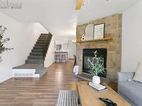 Beautifully updated end-unit townhome in Victoria Village, backing to open green space with access to Palmer Park trails. Interior upgrades include fresh paint, updated flooring, windows, light fixtures, doors, and cordless blinds. The kitchen features updated counters, a modern sink and faucet, and a pantry plus all appliances included. Both bathrooms have been fully remodeled with updated tile, vanities, and fixtures. Upstairs offers a vaulted primary bedroom with two closets and an attached bath, plus an additional bedroom. The finished basement includes a family room, 3/4 bath, laundry area with 2023 washer and dryer, and a non-conforming room great for a primary suite, guests or office space. Electrical panel replaced in 2024. Enjoy the community pool and a location close to UCCS, shops, restaurants, and military bases.