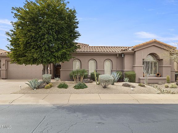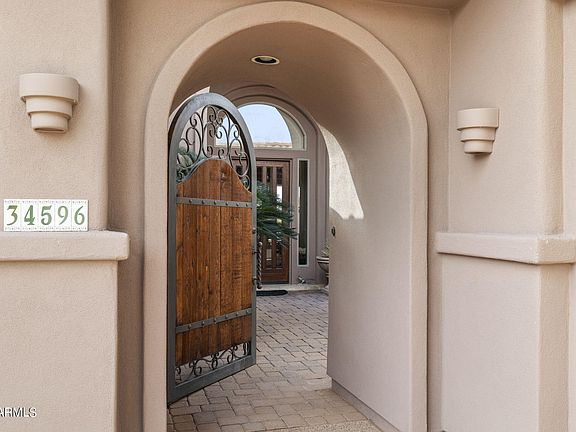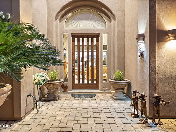 Welcome to this beautiful residence nestled within the prestigious gated community of Legend Trail. This captivating home offers 4 bedrooms and 3.5 bathrooms. As you approach, an inviting iron gate opens to a serene private front courtyard with lush landscape and water feature. As you enter, you'll be greeted by soaring 9+ft ceilings and an abundance of natural light streaming through the windows, offering picturesque views of the backyard oasis. The expansive living features a charming brick fireplace, providing a warm and inviting atmosphere perfect for relaxation or gatherings. Large windows offer views of the sparkling pool, enticing you to unwind and enjoy indoor-outdoor living at its finest. Both the front and back of the home include desert landscaping ideal for low maintenance and lock and leave lifestyle. The kitchen, ideal for culinary enthusiasts, is equipped with a breakfast bar accented by a brick knee wall and pendant lighting, granite countertops, ample white cabinetry, a pantry, and a striking blue kitchen island with a gas cooktop. Stainless steel appliances, including a double wall oven, elevate the functionality of this space, which also includes an eat-in area and a wet bar, making it perfect for entertaining. For more formal gatherings, the home offers a separate dining area with French doors leading to the front courtyard, enhancing the indoor-outdoor flow. Retreat to the luxurious primary bedroom offering expansive windows framing views of the backyard, a dual sink vanity, a separate tub and shower, and a generously sized closet. Additional highlights include a laundry room with more cabinet space for storage and a sink, as well as a split 3-car garage for added convenience. The private backyard area includes a built-in BBQ, fireplace and seating, perfect for outdoor entertaining. Enjoy the covered patio, offering a cool retreat on hot summer days, complete with a ceiling fan and electric awnings. Experience the sought-after amenities of Legend Trail, including golf, a clubhouse, fitness room, pool and spa, pickleball and tennis courts making this home an ideal choice for those seeking the ultimate desert lifestyle!