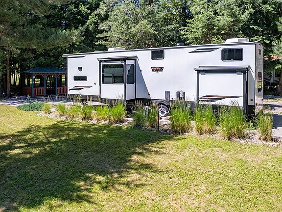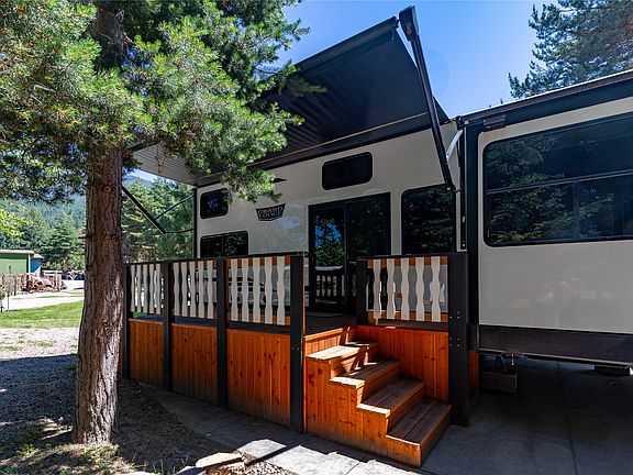 This 1/4-acre wooded lot offers a serene retreat with beautifully crafted concrete work, a gazebo, idyllic stream, fire pit, garden shed, and an outbuilding equipped with a shower, sink, toilet, W/D. Included is a 2023 Forest River Wildwood 42' destination trailer (446 sq. ft.) featuring a private primary bedroom with a king bed, two loft sleeping spaces, a walk-in shower, living room with a gas fireplace, and a spacious kitchen with a pantry. Enjoy the outdoors with a large awning and porch. Located just 5 minutes from public swimming areas, parks, and boat launches, with year-round boat storage available. HOA fees are $505 annually and include sewer, water, trash, road maintenance, and snow removal. A perfect way to enjoy Flathead Lake without breaking the bank!