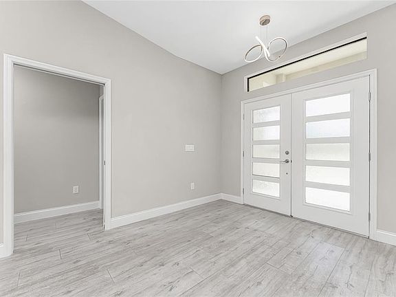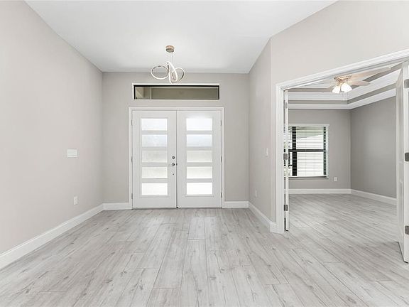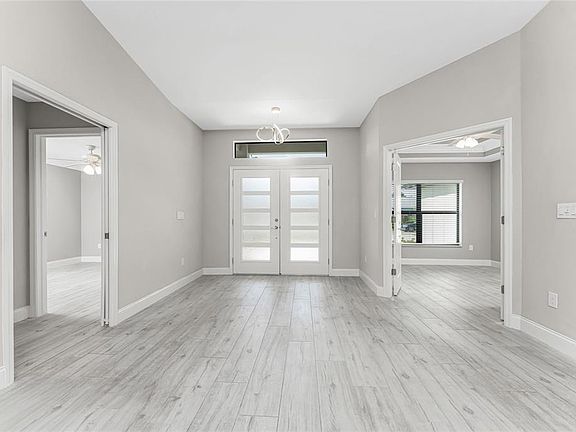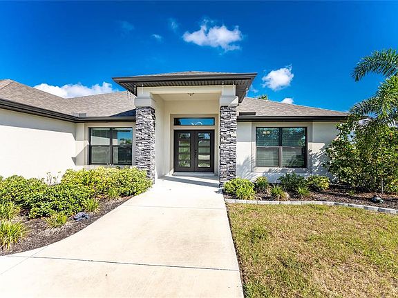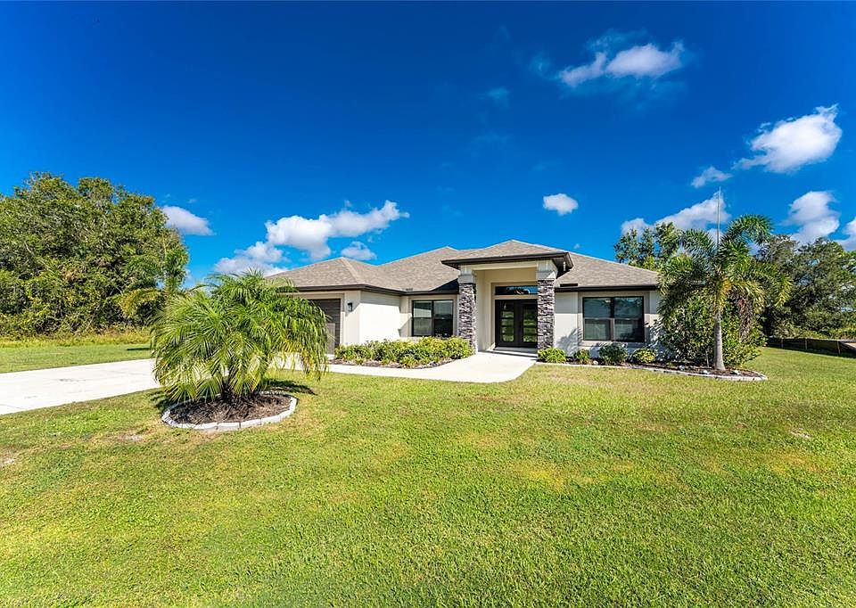 Built in 2022, stroll into this stunning home from the wide front side walk and large covered front entry which offers the charm of brand-new construction while being perfectly tucked away at the end of a cul-de-sac in the highly sought-after Deep Creek community. With over 1,800 square feet of living space, there’s plenty of room to entertain family and friends in style. Elegant custom finishes are found throughout — including custom impact rated 5 panel glass double main entry doors, trey ceilings, hard-surface countertops, tile flooring, and custom lighting — setting this home apart from others on the market. Laundry room access through to the garage features stainless feel front loading washer and dryer both on pedestal drawers for added storage plus sink and cabinetry features. Enjoy the spacious layout featuring a separate den with French glass doors, high ceilings, with a BUYER BONUS of multiple large flat-screen TVs with mounts already in place, perfect for Sunday night football. The master suite offers dual walk-in closets, dual sinks, a luxurious walk-in shower, and private access to the screened lanai. The split-bedroom floor plan provides privacy and functionality, complemented by an open kitchen and great room. The kitchen features a large eat-in island, separate dining area, pantry, stainless steel appliances, and abundant cabinet space. The air-conditioned two-car garage with epoxy flooring is ideal for keeping your vintage car or prized possessions protected from the Florida heat. Deep Creek is a deed-restricted community with low annual HOA dues of just $200 and access to exceptional amenities — including a community park, sidewalks, tennis and pickleball courts, basketball court, playground, and a scenic golf course — perfect for an active lifestyle. Conveniently located near I-75, Walmart, Publix, shopping, dining, and medical centers, plus beautiful Florida beaches are not but a quick drive away.