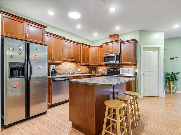 Open-concept kitchenMaple cabinetryStylish tile backsplashLarge islandDining areaPrivate patio spaceBuilt-in central vac