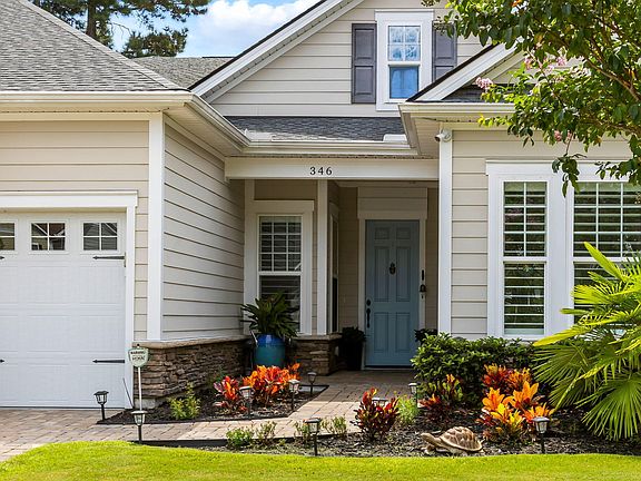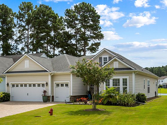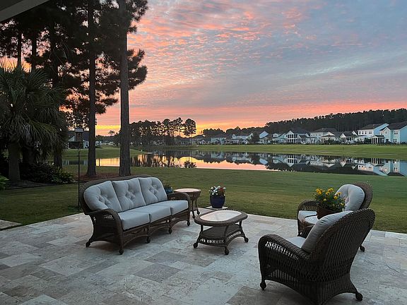MOTIVATED SELLER - Closing Costs and a golf cart. Nestled at the top of a quiet cul-de-sac, this exceptional one-story home offers sweeping 180-degree water views and is bordered by protected green space that will never be developed 'a private park' ensuring lasting privacy and serenity. With 2,572 square feet of thoughtfully designed living space, this 3-bedroom, 3-bath residence features a spacious open-concept layout, ideal for entertaining. The family room flows seamlessly into the gourmet kitchen and dining area overlooking the tranquil lakeThe main suite enjoys peaceful water views, while the guest bedroom includes a private en-suite bath. A third bedroom has access to a nearby full hall bath, and there's also a dedicated home office for added convenienStep outside to a newly installed travertine patio and custom barbecue area perfect for relaxing and watching the birds - including bald eagles and ospreys. The owner also upgraded the driveway and front walkway with elegant brick pavers, adding panache to the curb appeal. Interior highlights include soaring 10-foot ceilings, crown molding, hardwood floors throughout the main living areas, and plantation shutters on every window. The oversized three-car garage is outfitted with custom shelving and a staircase up to additional storage.