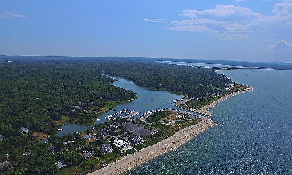 This wonderful waterfront Contemporary in East Hampton, includes panoramic views of Gardiners Bay, Shelter Island, Orient Point, and Connecticut. From over 600 square feet of decking, enjoy the most beautiful sunsets in the Hamptons, year round. The gourmet kitchen and beamed & vaulted great room have an open floor plan, perfect for entertaining friends and family with a gas fireplace, multiple skylights, and beautiful Brazilian wood floors. The master suite is located on the first floor and has a steam shower. The other two bedrooms share a bath with a Jacuzzi. The lower level features a guest suite that includes a bedroom with a full bath, and an open office and family room with bar sink and wine cooler making the home over 2500 sf (4 bedrooms and 3.5 baths). The backside of the home is equipped with rooftop solar panels. The property is just shy of a half-acre and has direct access to Hog Creek as well as steps away from deeded private lifeguarded Clearwater Beach & Marina. A one of a kind opportunity!
