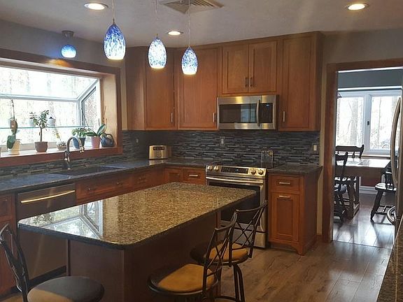 This Beautifully updated Tudor has an new kitchen with soft close cherry cabinets with under cabinet lighting, granite counters, large island with extra storage, ss appliances, recessed lighting. Bamboo floors in the dining room and living room along with a fireplace. 4 Bedrooms up stairs, including a large master with walk in closet, bath with walk in tile shower, and laundry in the bath. 2nd bedroom with walk in closet and storage over garage. First floor has second kitchen, bedroom, family room, and 3 season room. Possible in law . 2 car attached garage. Hot water heat by oil 4 zone, and central air (2 zone). 2.9 acres of land. Furnace is about 4 years old, indirect fired hot water, 1 year old. New well pump 2 years old. Solar lease may be be taken over by buyer with approval from the solar company. Also there is a 2nd fireplace in the family room.