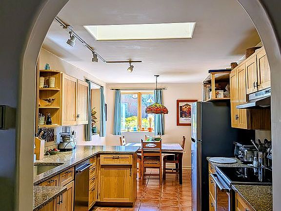 Step into this well-designed 2BR/2BA 1490 sq.ft pumice-crete home with attached 1-car heated garage or extra bedroom, depending on your needs. Impressive open living area with kiva fireplace, saltillo tile, viga ceilings, skylights, separate sitting area and a sliding glass door which opens to an extensively landscaped fenced back yard. The kitchen features granite countertops, new stainless steel appliances, and skylight. A separate dining area filled with windows and natural light is off the kitchen. The master bedroom has a walk-in closet and an ensuite bathroom with a walk-in shower and separate soaking tub. The second bedroom is airy and bright with a full bath with a skylight just off of it in the hallway. The in-floor radiant heat throughout the home, provides consistent comfort throughout the seasons, making this space a haven whether you're relaxing with family or hosting friends.