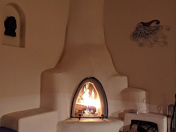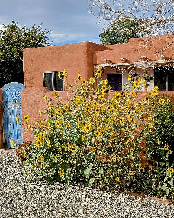 Pumice-crete homeKiva fireplaceGarden bedsRear portalOutdoor diningGranite countertopsSmall lawn