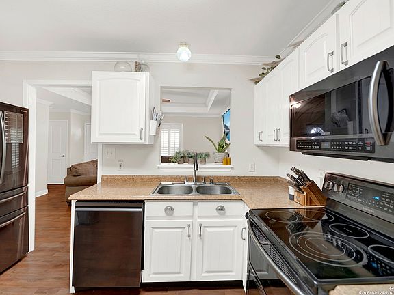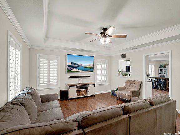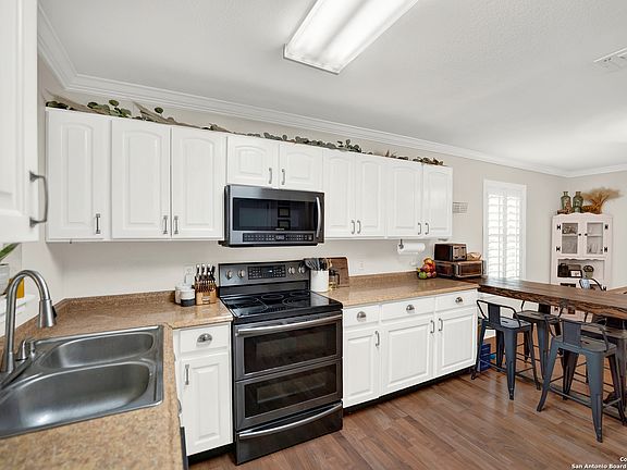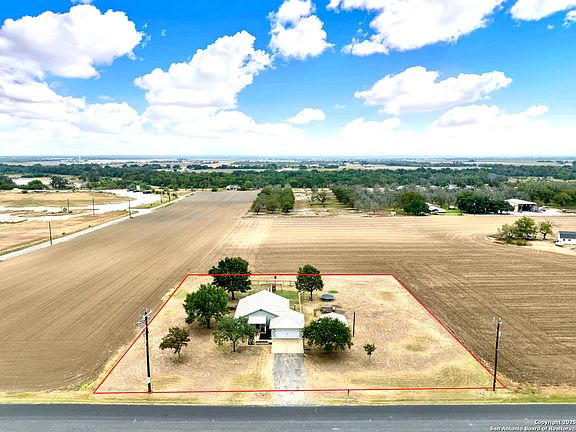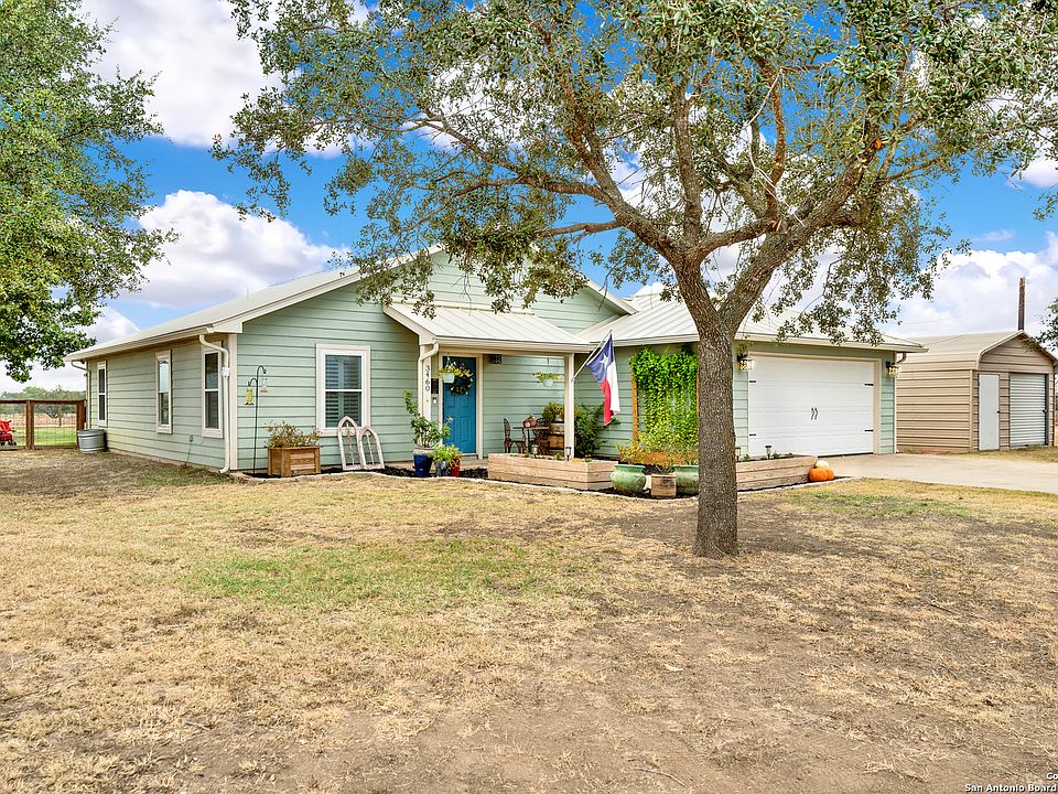 Welcome home to this beautifully maintained farmhouse-style property offering the perfect blend of small-town charm and modern comfort. Just 30 minutes from San Antonio, this home provides easy access to the city while feeling worlds away. Enjoy the peace and quiet of the countryside - during crop season, you'll hardly see a neighbor, making this property feel private and secluded. Inside, you'll find an inviting layout with an eat-in kitchen featuring stainless steel appliances, ceiling fans in every room, and farmhouse touches throughout, including wooden shutters on every window. The ranch-style fenced backyard is perfect for relaxing or entertaining, with a covered patio, playscape, garden area, dog run, and storage shed. A two-car garage, new roof with gutters, and automatic dusk-to-dawn lighting add comfort and convenience. Experience quiet country living just a short drive from the city - this home truly has it all.