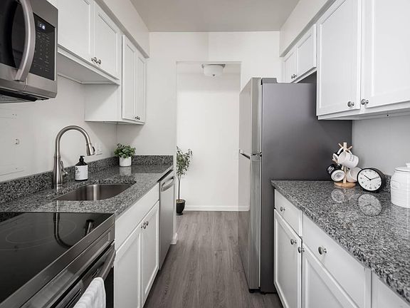 Resort-style poolWhite shaker cabinetryCovered parkingGranite countertopsNew appliancesLuxury tile flooring