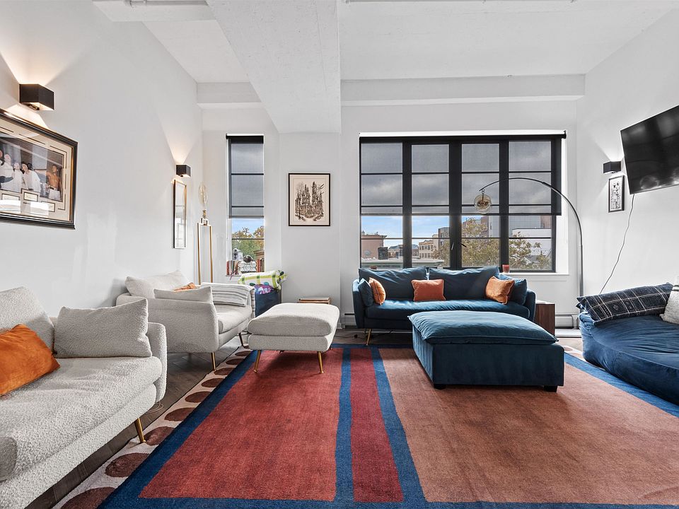 I am thrilled to present a unique opportunity to elevate your lifestyle with Residence 3C at The Packard JC, where modern elegance meets effortless comfort. This stunning two-bedroom, one-bathroom loft-style condo spans 1,006 sqft and is bathed in natural light from expansive windows that complement its soaring 12-foot ceilings. The living room also offers views of the World Trade Center.