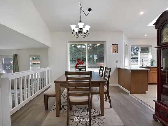 Well maintained 3 bedroom 2.25 bath home nestled on .13 acres in easily commutable area. 1740 sq ft offers formal living room w/new plank vinyl floors, white trim, vaulted ceilings, faux wood blinds & several skylights. Step down to the family room & snuggle up to the cozy fire place. Upstairs you'll find all 3 bedrooms w/lush carpet. Master suite located at the back of the home for privacy & includes walk in closet, bathroom and peekaboo view of Mt. Rainier. The other 2 bedrooms offer window seats, one with storage. Backyard paradise w/deck and seating, romantic trellis, & privacy w/large trees. Hardie siding, A/C unit, 10 year old roof, outside storage. Easy HOA. Down the street from elementary school, & BPA walking trail system.