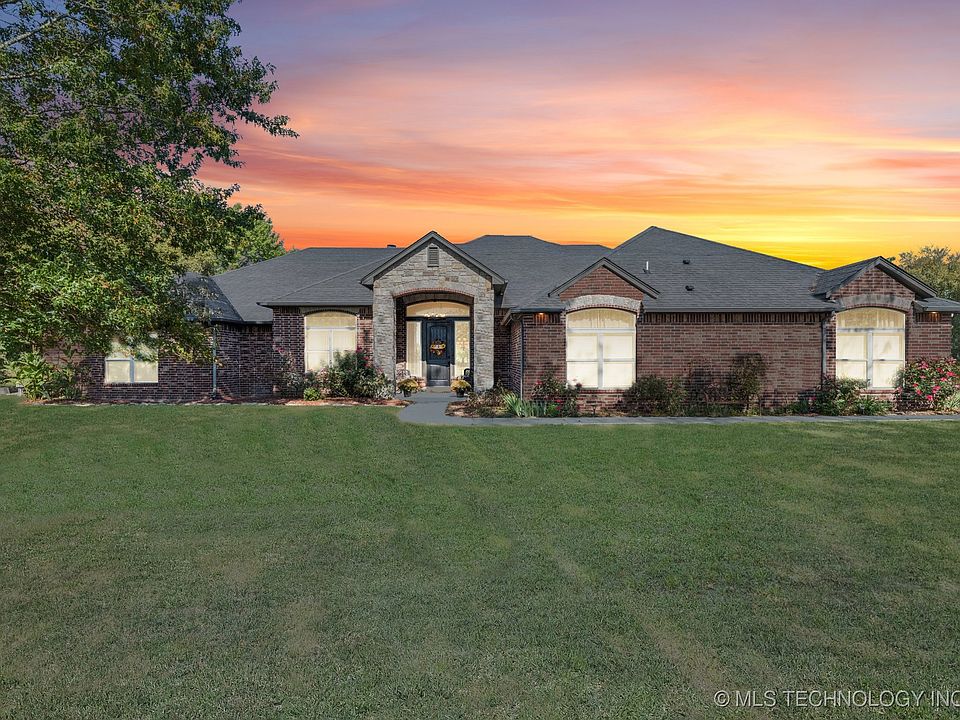 Realize your country living dreams NOW with this gated estate on a private and serene 20 acres! Pond? Yes! Barn? Yes! Pool with waterfall? Yes! Brick fire pit? Yes! Space for your hobbies? Yes! The stunning brick & stone, single-story home sits well beyond the brick entryway, behind the white rail fence at the end of the tree-lined drive. The open living area features hand-scraped hardwoods and a fireplace. Open kitchen w/ xl granite island, bar seating, wall ovens, pantry, rich cherry cabinetry w/ wine rack. Master suite has a double-sided fireplace shared w/ bathroom! Tray ceiling, double vanities, jetted tub, and large double entry walk-in shower. Laundry room & drop zone. Barn has covered stalls. Large pond w/ dock. Storm cellar. This custom retreat was well-planned and enjoyed. Looking to get away? This is the one!