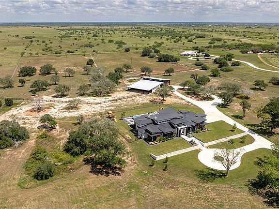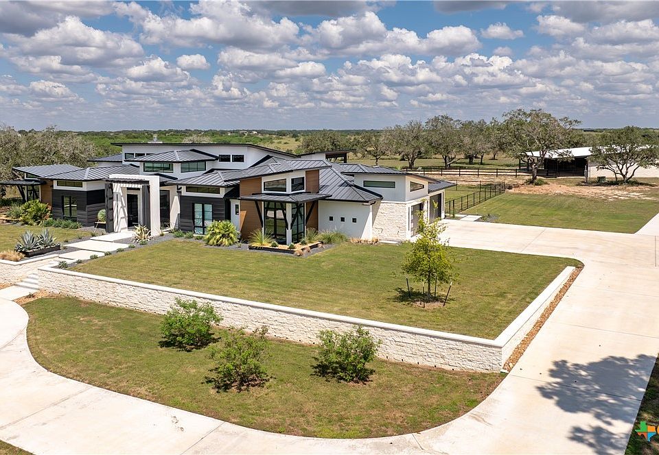 Hill Country Elegance Meets Modern Sophistication. Welcome to the crown jewel of Victoria, TX — a one-of-a-kind estate where Hill Country charm blends seamlessly with sleek modern design. Spanning over 4,300 square feet, this architectural masterpiece showcases four bedrooms, four and a half baths, a private office, a versatile flex room, and even a secure safe room — all crafted with the finest attention to detail. Floor-to-ceiling glass windows flood the interiors with natural light and frame breathtaking views of the grounds. Designer touches abound, from the dramatic vaulted ceilings and custom fireplace to the stunning wine wall and luxurious finishes throughout. Step outside to an entertainer’s paradise: a resort-style pool with an acrylic glass wall, sunken fire-pit lounge, and a fully equipped outdoor kitchen with its own fireplace. A private pond, scattered trees, and a custom gated entrance set the scene for privacy and serenity. Equestrian enthusiasts will be captivated by the exceptional horse facilities — oversized stalls with runs, a barn bathroom for convenience, and an attached shop with a climate-controlled tack room complete with cabinets, sink, and mini-split system. Ample space throughout the property makes it ideal for horses or cattle. All of this is perfectly located just minutes from town, with the added benefit of being near the Texas Gulf Coast. There is simply nothing else like this estate in Victoria — a property that defines luxury living with timeless architecture, modern sophistication, and unmatched amenities.