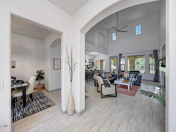 This sophisticated model-style home is located in the exclusive gated community of Vallarta and offers everything Verrado is known for. Perfectly situated on a premium corner lot adjacent to the private community pool, this move-in ready home features an open and airy great room concept with soaring 22' vaulted ceilings, 10' ceilings in the remaining areas, which seamlessly connects indoor and outdoor living, making it perfect for entertaining. The chef-style kitchen boasts quartz countertops and a high-end Dacor gas range with air fryer, convection, and self-cleaning features. All kitchen appliances are just three years old, RO water drinking system and the washer, dryer, and refrigerator all convey. Additional upgrades include a newer A/C unit (2024), a hot water heater (2018)... a whole-house water filtration system and fresh custom interior paint. The home features a spacious split floor plan with a cozy gas fireplace in the living room and an electric fireplace in the primary bedroom, which also includes its own private side entry to the backyard. The luxurious primary bath offers a spa-like experience with a soaking tub, granite tile shower, a high-end shower panel tower system with jets and steam, dual vanities, and a large walk-in closet. The additional bedrooms also include walk-in closets, and the remodeled second bathroom features another spa-style shower system. Step outside to your private oasis backyard with peek a boo mountain views, complete with mature landscaping, extended pavers leading to the front of the house , a watering system for plants, automatic landscape lighting and a large covered patio with ceiling fans perfect for relaxing and entertaining. The oversized two-car garage provides ample storage and convenience. Vallarta residents enjoy exclusive access to a private community pool set along tree-lined streets and lush green surroundings. The HOA includes gated access, exterior paint, road maintenance, front yard landscaping with water irrigation, and pool access offering truly lock-and-leave, maintenance-free living. Beyond the gates, Verrado offers a vibrant lifestyle with local dining, shopping, top-rated A+ schools, over 78 parks, hiking and biking trails, two additional outdoor pools, and a state-of-the-art fitness center. Year-round community events foster a strong sense of connection, and future developments including a new outdoor shopping center and medical campus just down the road ensure even more convenience and value. Don't miss your opportunity to experience the very best of Verrado in the luxurious and private enclave of Vallarta. This exceptional home is priced to sell and ready for immediate move-in!