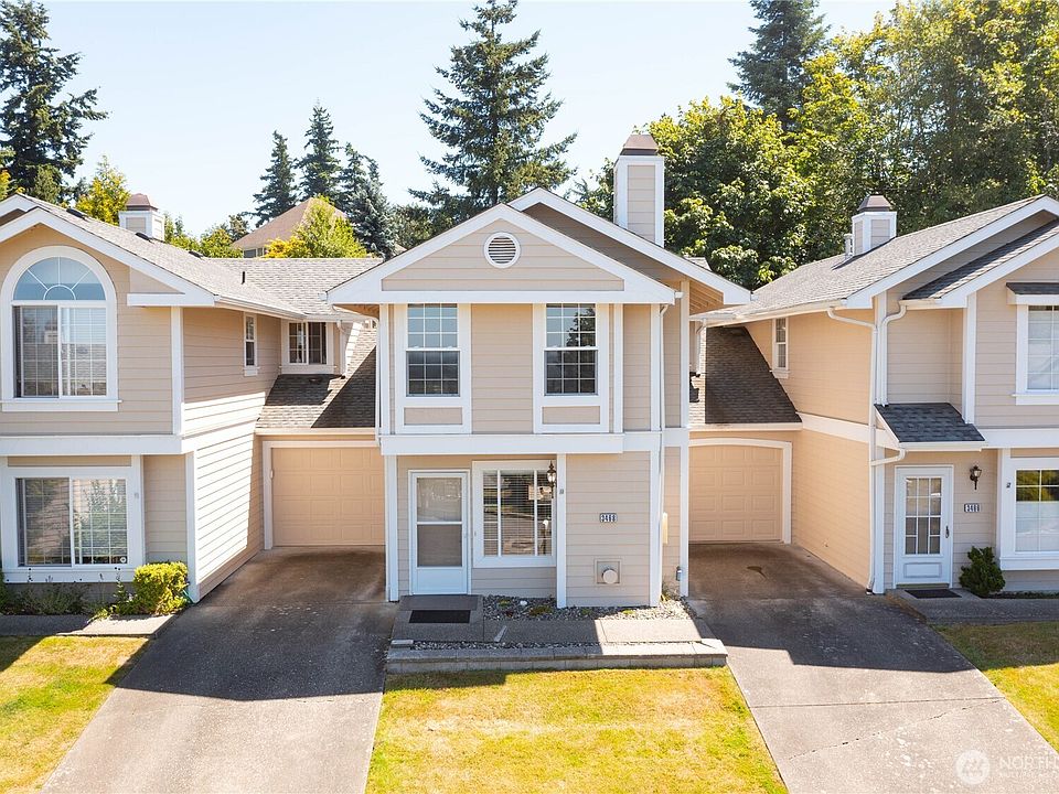 Enjoy convenient, low maintenance living, Bellingham Bay view, and amazing sunsets from this 2 Bedroom 2.5 Bathroom condo in Barkley. Lives like a townhome with no shared walls! Fresh paint, open layout, & abundant natural light. Main floor features living room, guest bath, & kitchen with dining area. Slider opens to a fenced courtyard backing to Northridge Park, very private and quiet. Upstairs: primary w/ ensuite & walk-in closet; second Bedroom with bay views & private ¾ bath. Deep 1-car garage w/ storage. Water, sewer, and lawn service included in the monthly HOA fee. Easy trail access to the right of the condo. Prime location near Barkley Village, Lake Whatcom & trails.