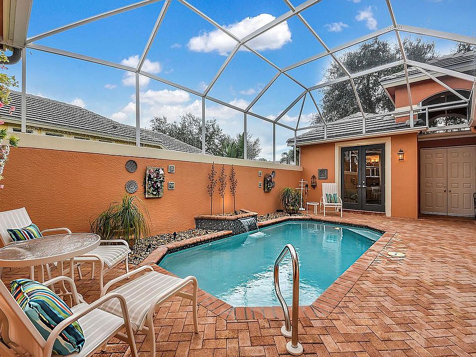 Completely renovated residence w/private expansive view of lake from lanai protected by StormSmart hurricane electric blinds. All appliances updated. Power sunshade in pool area. HVAC systems (2) under warranty. Ceiling fans in every room. Unit end of cul-de-sac.  Garage floor epoxy sealed tuxedo design. New liftmaster door outside remote opener +2 handheld transmitters. LG refrigerator, see-through door, automatic icemaker, guest cabana furnished with full bath separate HVAC system. Pool cage excellent condition.