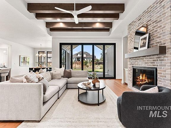 Welcome to this exceptional single-level home by Iron Oak Homes! Designed with timeless style and modern functionality, it features an open floorplan with soaring ceilings, Andersen windows, neutral finishes, and designer lighting. The great room boasts a floor-to-ceiling brick fireplace and Steelsen telescopic doors that extend living to a covered patio. The gourmet kitchen includes designer stainless appliances, ceiling-height cabinetry, a panelized refrigerator, and spacious pantry. The luxe primary suite offers patio access, a spa-inspired bath with walk-in shower, soaking tub, and a show-stopping closet connected to the laundry. A versatile fourth bedroom serves as an office, bonus room, or guest retreat. Additional highlights include a spacious garage with oversized boat bay and 11’ ceilings. Enjoy Centerra’s pool, walking paths, and proximity to downtown Eagle.