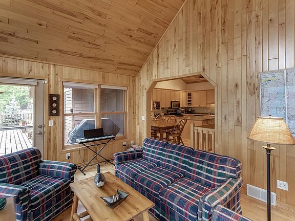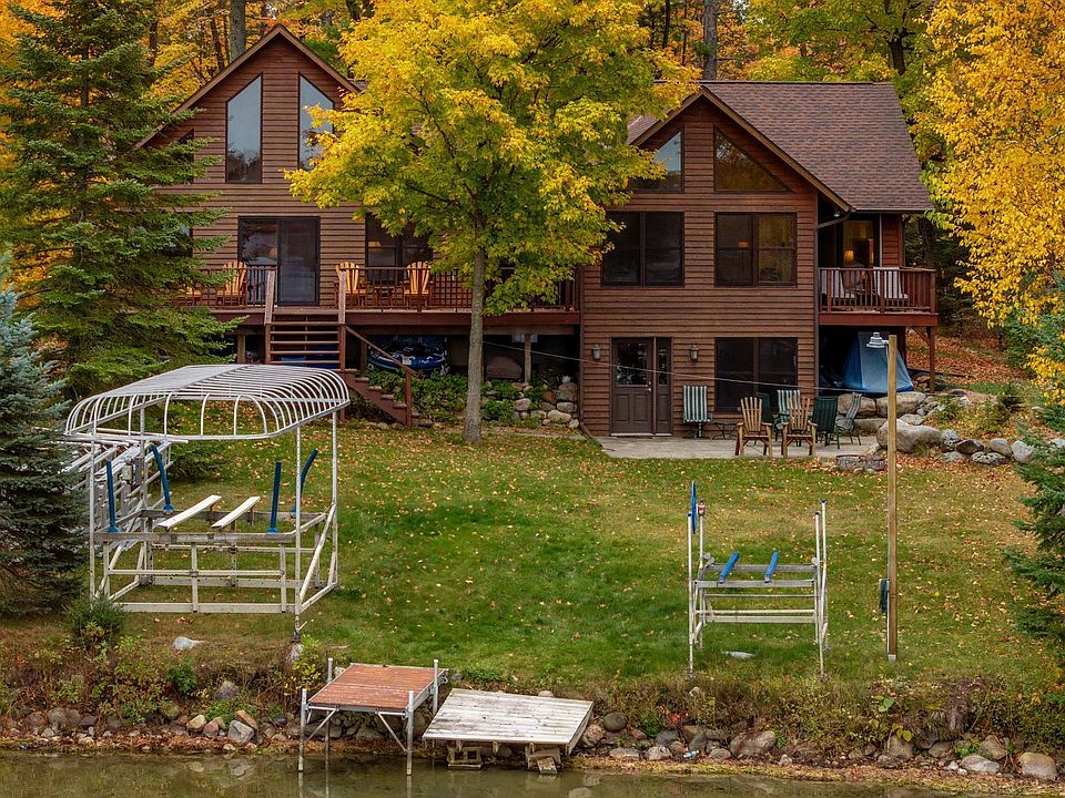 Hardwood floorsCovered front porchWestern exposureWall of lakeside windowsCedar sidingVaulted ceilingsLevel sandy shoreline