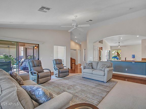 Looking for serene golf course living in PebbleCreek's premier 55+ Community, then you will want to see this beautifully maintained Oakmont model nestled in the heart of PebbleCreeks vibfant amenities -- golf, fitness centers, pools, 36 Pickleball Courts, and numberous Clubs and Organizations. This single-family home offers stunning panoramic views of two lush golf fairways, and a tranquil lake -- perfect for morning coffee or evening sunsets. There are two bedrooms and bathrooms, inclufing a heated bidet for added comfort. Warm, elegant wood flooring throughout with tile in baths and cozy carpeted bedrooms. The living room has a custom wall-mounted fireplace with integrated heater beneath the TV -- both stylish and functional. The kitchen has granite countertops and updated appliances. T There is a 2-car garage with numerous built-in cabinets.