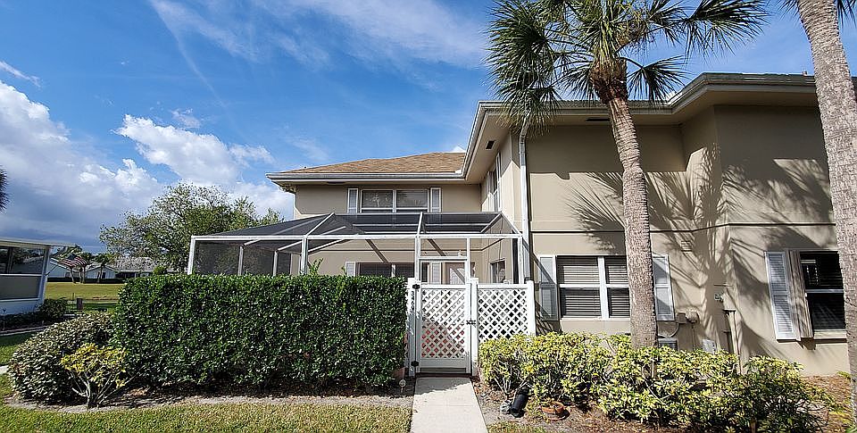 Sunset Trace beautiful gated community in Palm City. Concrete with stucco two bedroom and 2 1/2 baths townhouse with a pretty lake view and fountain view from living room. Granite tops and stainless range and fridge. New AC condenser outside. Central vacuum. Newer water heater. Walking distance to shops, restaurants, gym, medical facilities and banks... Starbucks too. The community boasts an Olympic size pool, as well as a regular size swimming pool close to townhouse. Bike, walk your dog, it's well lit with sidewalks and cascading oak trees, with a nice basket ball area, playground and tennis courts. It's a family oriented community with the bonus of Palm City A plus schools. Brokers welcome. Please call 772 486-8825 for a showing.
