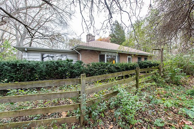Lovely hill top location overlooking Brandenburg Lake and island on 2+ acres of waterfront property. Solid brick mid-Century Modern ranch offers a quiet setting and a superb opportunity to update/upgrade. Large living room with stone fireplace, 3 season enclosed porch with pine walls and beadboard ceiling, hardwood floors under the carpet in the living room and bedrooms, original kitchen and bath, newer roof. Lived in and loved by the owner for the past 30+ years, it is time for a new owner to come in and make it theirs! Brandenburg Lake is a private spring fed lake, great fishing, electric motors only, quiet, serene, and not connected to the Chain.