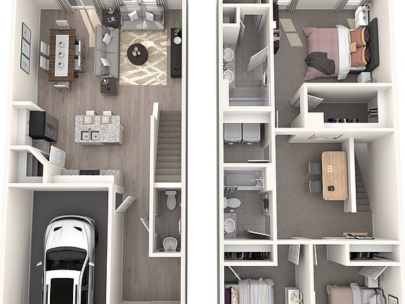 Invite friends over to watch the big game in the upstairs loft. Downstairs, the kitchen island overlooks the great room. White cabinets with white quartz countertops, oak EVP flooring and multi-tone tweed carpet come in our Sleek package.