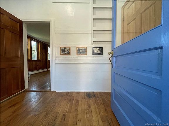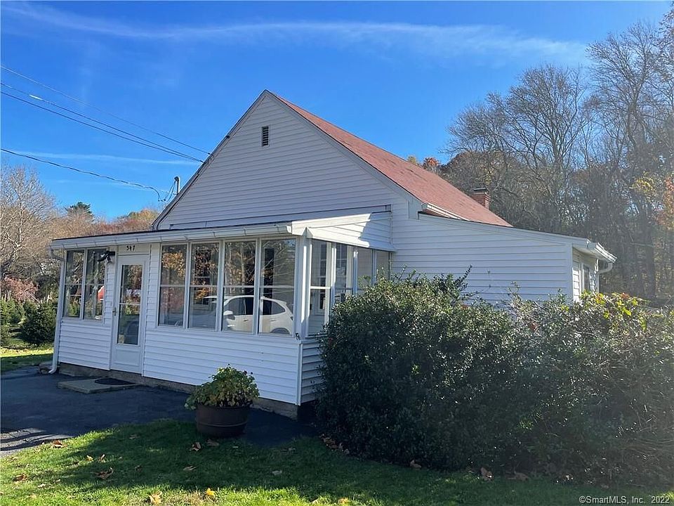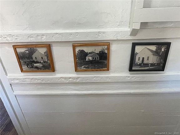 Enjoy owning a piece of Old Mystics history in this vintage 1760s Burnetts Corners School which has been converted to a single-family home with updated electrical and oil heat. This 2 BR/1 BA home sits on a private, flat lot with a large side yard, two outbuildings ready for use, and is adjacent to a Christmas tree farm! Enter through the front door into the freshly painted enclosed porch leading into the open living room with knotty pine accent walls. The large eat-in kitchen with gas stove is a perfect gathering place for family and friends. This home has wood floors throughout is a great downsizing opportunity with the main floor bathroom containing the laundry area, tub and pedestal sink. Come and see this historic gem!