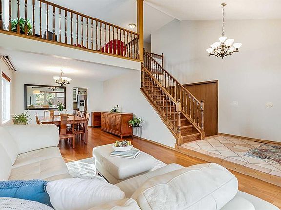 Rich hardwood flooringStriking vaulted ceilingNatural lightFormal dining areaOpen-concept kitchenCream cabinetryGranite countertops