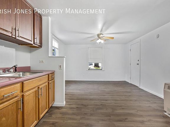 Natural light brightens the open living space, and the efficient kitchen provides wood base cabinetry with matching overhead storage; tenants bring their own appliances to suit their setup.
