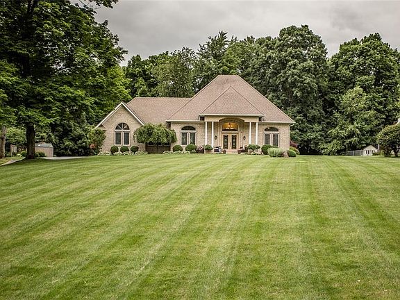 Stunning brick home with over 3300 sq. ft of finished living area includes the Full, beautifully finished lower level. Eat in Kitchen has been updated with white cabinetry and corian countertops. LG appliances stay. Kitchen opens into dining area and living area with massive ceilings. Solid Brazilian chestnut flooring throughout first floor. Both baths on first floor have been updated, as well. Laundry is located on first floor. 12x30 Trex deck with 6 person hot tub is located just off kitchen and living area through French doors. 2 sided gas fireplace is between kitchen and living areas. The lower level is a dream. All newer, waterproof Corelux flooring. Bar area, foosball, pool table, electric fireplace, theatre area with 6 theatre seats, projector and automated projector screen that stay with home. Extra area, used as utility 33x11, could be made into another bedroom if needed. Updated half bath is also located in lower level. 3 car attached garage. Immaculate well kept yard.