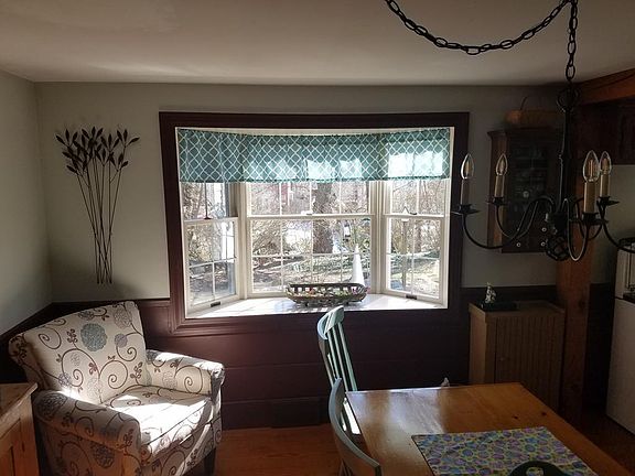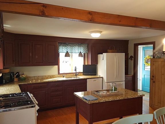 Sweet dormered cape style home situated on private 1+acre lot. Entire property meticulously maintained during ownership. Kitchen boasts granite counters and plenty of storage space. Appliances included~bonus~1940's OKeefe & Merrit stove. Matching island will stay. Gleaming wide pine floors. Beamed ceiling and bay window dress up the dining area. Spacious living room with oak flooring, wood stove, ceiling fan and picture window overlooking landscaped yard. Sliding doors open to a pleasant three season room large enough for extra guests during holiday times. Master bedroom has pine wood flooring, double closets and six panel doors. Second bedroom has double closets and wide pine floors. Bath has tub and shower, pedestal sink, large linen closet and tile. Unfinished second floor has potential for another bedroom and lots of storage. Beautifully maintained 18x36 inground pool with brick and cement patio area. Pool house with dressing area and storage for pool supplies. Satellite dish.