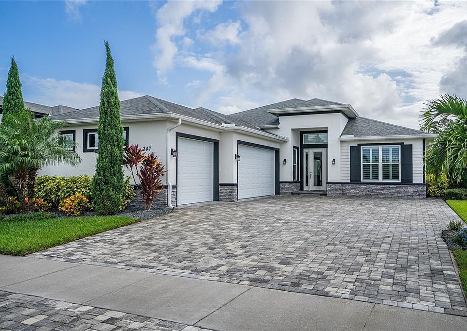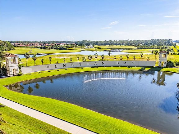 One or more photo(s) has been virtually staged. Experience refined Florida living in this beautifully crafted 3-bedroom, 2-bath Johnson-built custom home, complete with a 3-car garage and dedicated office space. Perfectly positioned to capture expansive, long-range lake views, this residence offers both elegance and tranquility. Step out to the extended screened-in lanai—ideal for relaxing or entertaining—while enjoying the serene waterfront backdrop. Inside, thoughtful upgrades include luxury vinyl plank flooring throughout, detailed crown molding, and a beautifully appointed primary bath with upgraded tile finishes. Nestled in the prestigious golf course community of Venetian Bay, this home combines elevated design with a coveted lifestyle. Additional features include gutters, a sun tunnel for added natural light, and a custom front door with built-in blinds. The kitchen is a chef’s dream with quartz countertops, recessed lighting, stainless steel appliances, soft-close cabinets and drawers, and upgraded door hardware. Both the guest and primary bathrooms are finished with quartz countertops, and crown molding enhances the living room, dining area, and kitchen. Enjoy the added convenience and style of French doors—also with built-in blinds—leading to the lanai, plantation shutters throughout the home, an epoxy-coated garage floor, paver driveway, and ceiling fans in every room, including two on the patio. Furniture is negotiable, making this move-in ready home even more appealing. Schedule your showing today and experience why this home at 347 Venetian Palms Blvd should be your new home-sweet-home!