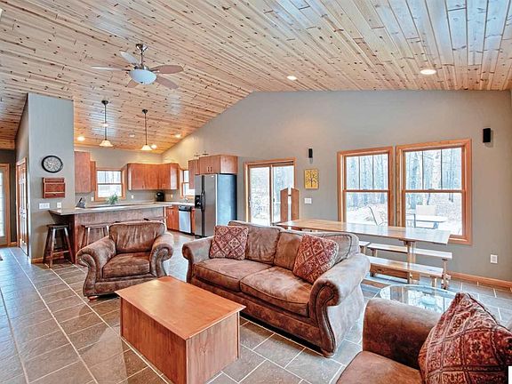 This 2007 single-level home has the decorative accents and low maintenance features to set it apart from the rest, not to mention a lovely country setting just 7 miles from town. Well thought-out design features include the stacked stone facade echoed by the fireplace inside, as well as the exterior cedar shake gables and the interior T&G vaulted ceilings of the Great Room. Raised ceilings elsewhere provide an added dimension of spaciousness. The roomy kitchen with seating at the peninsula will have everyone gathering around. Other features include: Energy efficient dual-fuel in-floor heat with propane fireplace and air exchanger system; large utility room with laundry cabinets; stamped concrete walkways, porch, and patio; and over-sized garage with full attic storage - like having an upstairs basement! Enjoy the natural surroundings, garden, and fire pit in the back yard.