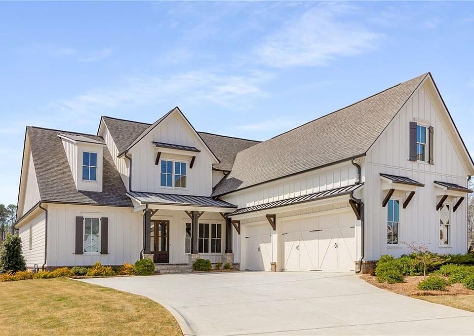 This stunning modern farmhouse, built in 2022, is the perfect blend of modern luxury and classic charm. As you step through the grand double doors you are immediately welcomed by a breathtaking view of the tranquil pond. The open concept design allows natural light to pour in, illuminating the soaring faulted ceilings, wooden beams and wide planked hardwood floors. The entry way flows seamlessly into the great room where the fireplace and built-in bookcases anchor the space. Just beyond, is the open concept, eat in, gourmet kitchen that is every chef's delight. Enjoy your morning coffee either from the eat in kitchen or the covered patio while taking in the serene water views. The first floor primary suite is a private sanctuary, thoughtfully designed to maximize comfort and the breathtaking views of the pond. As you enter the suite you are drawn to the wall of oversized windows that frame the water, filling the space with natural light. The spa-like ensuite bathroom is a true retreat featuring a freestanding soaking tub, a spacious glass enclosed walk in shower and double vanities that provide ample storage. Beyond the bathroom, a generous walk-in closet with build-in shelving ensures plenty of space for your wardrobe. Located just off the kitchen is a versatile space that offers the perfect blend of functionality and charm, designed to serve as either a stylish home office or cozy coffee bar-all while overlooking the serene pond. Also featured on the main level is a generously sized secondary en-suite bedroom, a built in drop zone, laundry room and a half bathroom. The upstairs includes three spacious bedrooms, each with its own en-suite bathroom. The expansive daylight basement is a versatile space, partially finished to offer both functionality and future potential all while taking advantage of the stunning pond views. Stepping outside, the flat backyard extends from the basement level, creating a seamless transition to the beautifully fenced in backyard. This home is situated in the highly sought after Lassiter High School district, known as one of the top rated schools in Georgia.
