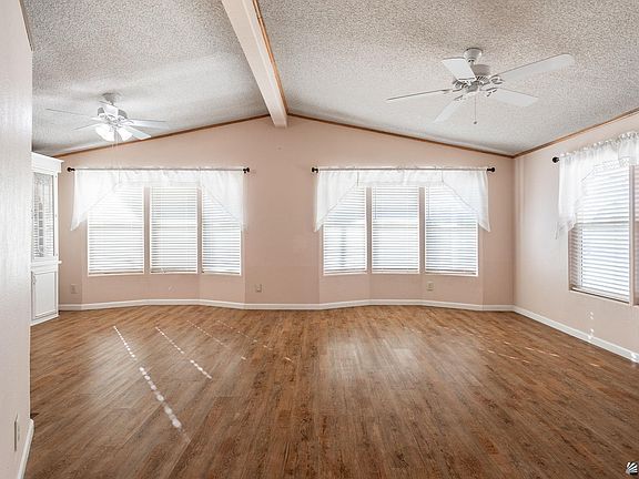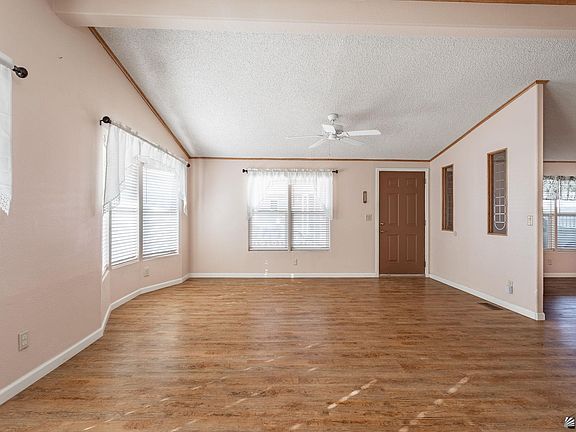 Welcome to this stunning 2-bedroom, 2-bath manufactured home nestled in the charming Rio Colorado Est 55+ Community. This spacious residence offers wonderful updates throughout, featuring lovely wood laminate floors, modern windows, tape and textured walls, and vaulted ceilings. The beautifully renovated kitchen showcases white cabinets with neutral countertops, and updated lighting, while the bathrooms offer modern vanities and recently installed step-in showers. Entertaining for the holidays will be a breeze in the large living room, spacious dining area, and separate family room. Plenty of natural light streams in through solar tube lighting and a skylight. The generous utility room is equipped with ample cabinets for storage, countertops for folding or hobbies, and an additional refrigerator. The fully enclosed AZ room adds 408 square feet and is perfect for guests, a man cave, or any creative space you desire. Enjoy it comfortably with the mini-split unit or open the drapes and let in the sunshine! The AZ room leads to the insulated 1-car garage. On the north side of the property, you'll find a covered carport and patio area equipped with a TV hookup, along with a storage shed powered with electricity. RV parking & hookups are conveniently located in the back, with double gates for easy access. Recently raised block walls provide added privacy. Don’t forget to explore the fabulous community clubhouse, pool, spa, and friendly community events all included with a low HOA fee!