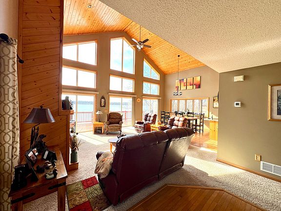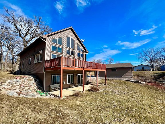This absolutely stunning lake home on Big Stone Lake was built in 2003 and sits on nearly three acres of land with 280' of shoreline. Three levels of comfortable living spaces, each with a breathtaking view of the lake. The lakeside windows tower above the main level living room, dining room, and kitchen. There are two bedrooms on the main level. The upper loft area is a great space, hosts two beds currently and can be used as a primary suite with attached bath. The finished walkout basement is set up for fun entertainment with a built in bar and cozy second fireplace. There is another bedroom and bathroom on the lower level as well. The sprawling yard offers seclusion and space. The lakeside fireplace is a perfect place to take in the sunsets over Big Stone. There is also a large insulated detached garage as well as a pole building on the property as well. This place has it all, Let's have a look!