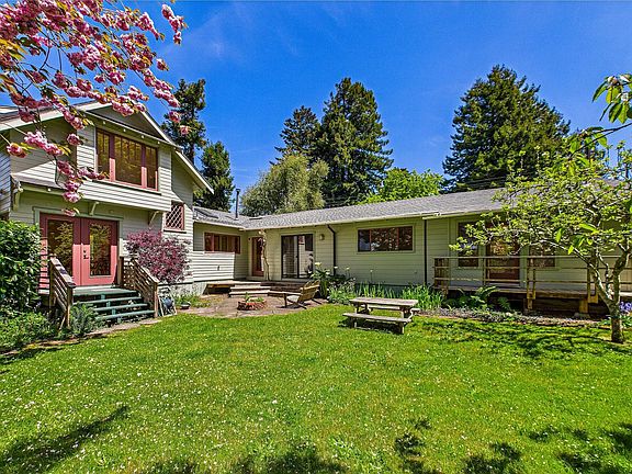 With an abundance of charm, this 3 bedroom 2 bathroom home sits peacefully on over an acre of enchanting property, full of light through skylights and french doors leading to secret garden nooks, there is spring time views out every window! The kitchen is well equipped with amazing storage capacity in the wooden cabinetry, the upstairs tucked in bath and bedroom is whimsical with coved ceilings and ship lap floor. Attached to the main home is a second unit with kitchenette, and full bed, bath and living room offering much possibility for ways of living or could easily be re-invented to add to the main home. A detached cottage offers storage space in front, offering 2 bedrooms and 1 bath downstairs with full kitchenette, and 1 bedroom 1 bath upstairs with gleaming fir floors and kitchenette too, giving potential for two units. With previous garden flats ready to be thriving once more, and dappled with established fruit trees and green grassy yard space, as well as a large metal shop with tall roll up doors, for all of the garden tools or RV parking. This property holds a magic all its own, come and take a look!