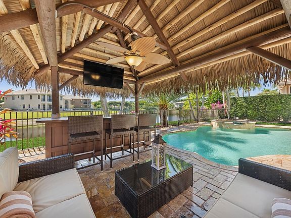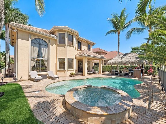 This exquisite 5BR/4.5BA/3CG lakefront pool home is located in the prestigious Versailles community in Wellington, FL. With its impressive two-story design & fabulous outdoor oasis, this estate offers a perfect blend of elegance, comfort & modern convenience. The interior is nothing short of stunning. From custom paint to elegant millwork, every detail has been thoughtfully curated. There's a formal LR, DR & FR so everyone can enjoy their own space & one ensuite BR down w/cabana bath. Step outside to your private tropical retreat, where your saltwater heated pool w/ raised spa awaits, surrounded by a stunning travertine deck & beautifully updated tiki hut w/ cable-ready mounted TV, which now features synthetic thatch that is hurricane rated, bug & fire-resistant--perfect for quiet evenings or entertaining. All this, w/ a southern rear exposure backdrop. Other notable features of this immaculate home include Brazillian cherry wood floors on stairs & 2nd floor, primary bath has garden tub, separate shower & dual vanities, pool, irrigation & cameras throughout property--all automated from phone, WH, stovetop & dryer are gas, pool built in 2007, all new landscape & lighting, pool equipment updated in the last few yrs, full gutters around the house & the water for the irrigation comes from the lake, so there's one less expense. Versailles is an amazing gated community featuring 450 SFH with French-inspired design, located in proximity to many fine & casual dining restaurants, all the equestrian events, Wellington Green Mall & approx 15 min from PBIA & 25 min to our breathtaking South FL beaches!