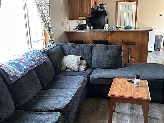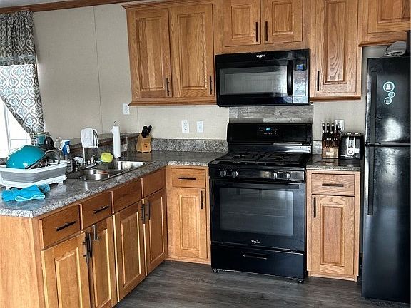 Newer 16' wide manufactured home, spacious open floor plan, 22' living room with wood burning fireplace, stone surround, wood mantle. Living room open to kitchen dining, raised breakfast bar, oak cabinets, appliances, utility room with pantry cabinet, dining area has glass sliding door. Lots of natural light, vinyl flooring throughout home. Owner suite with walk in closet, bath has large vanity, shower. Guest bath has tub/shower, over commode towel cabinet. Spacious front bedroom with dual entry closet. Storage shed.