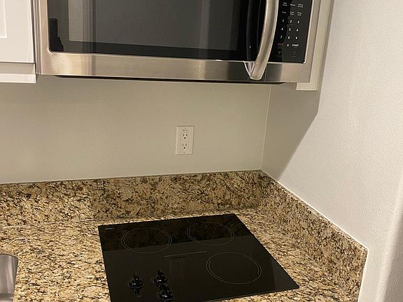 with Private Entrance, new laminate flooring throughout. The kitchenette has granite countertop, microwave, dishwasher (not shown on picture) electric stovetop with 3 burners, garbage disposal, Large pantry and includes normal size fridge (8 cubic ft.)