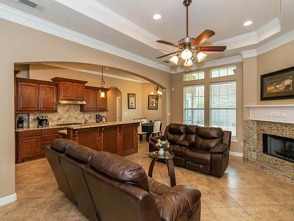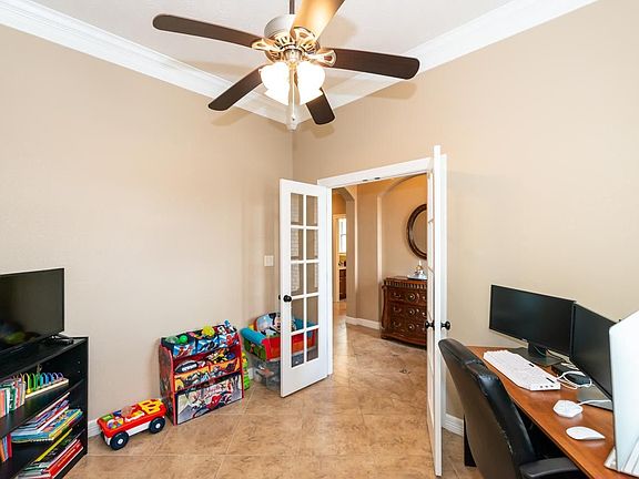 Beautiful custom home just 7 years young! Lovely custom choices begin w/the pretty French door entry. Accent tiles set off the generous interior entry. French doors also lead to the office/playroom/4th bedroom. Open living space includes a wall of bookshelves w/rich cabinetry for additional storage. The corner fireplace w/gas logs has gorgeous granite framing. Upgrades in the kitchen include the built-in stainless oven & microwave along w/a wonderful gas cooktop, & you will LOVE the WALK-IN PANTRY! Long breakfast bar is perfect for serving guests, casual meals or watching the chef. Primary suite is so spacious w/pretty bay window. En-suite bath has it ALL including double sinks, separate vanity, walk-in shower w/a seat, long jetted tub & FABULOUS closet! All of the bedrooms have crown molding & wonderful natural lighting w/additional bay window in the front bedroom. Mudroom cabinetry by laundry room is super convenient. Security system & backyard flood lights. WELCOME HOME!