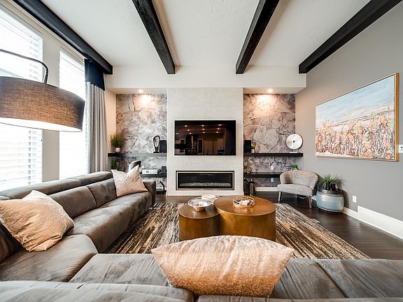 Rare reverse walk-out basementPrivate theatreWet barFitness roomSpacious bedroomsStriking leather-textured feature wallWhimsical staircase