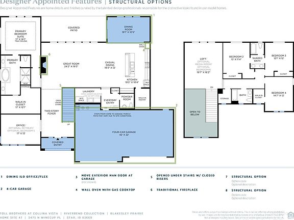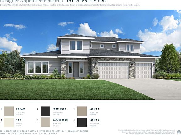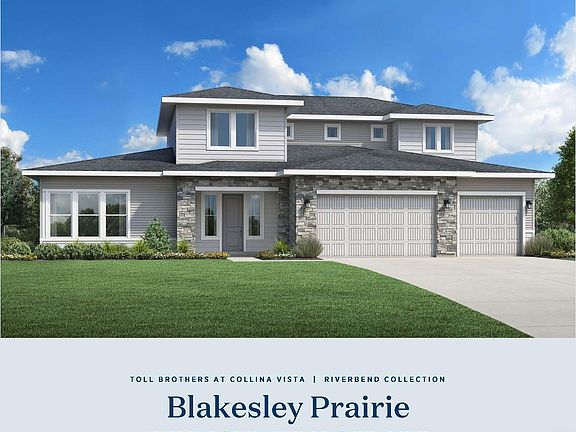 "The Blakesley". The spacious open concept great room and casual dining area overlook the charming foyer, the large covered patio, and the well-designed kitchen highlighted by a large center island with breakfast bar, plenty of counter and cabinet space, and a sizable walk-in pantry. The marvelous primary bedroom suite is defined by a beautiful tray ceiling, an ample walk-in closet, and a charming primary bath with dual vanities, a large soaking tub, luxe shower with seat, and a private water closet. Two of the secondary bedrooms feature roomy closets and a shared bath with separate dual-sink vanity area; another bedroom features a walk-in closet and a shared hall bath. Additional highlights include a generous loft, an ample office off the foyer, formal dining, easily-accessible laundry and a powder room off the everyday entry, and additional storage throughout. 4 car garage. Home is under construction. Photos are similar. BTVAI